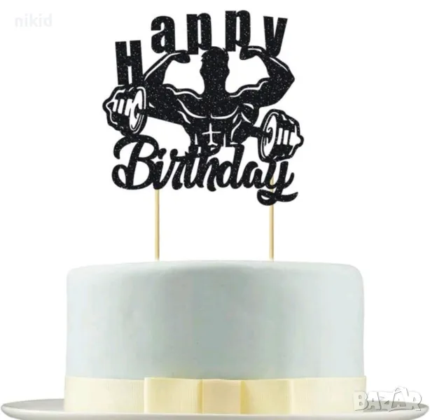 Културист спортист с гири щанга Happy Birthday картонен топер украса декор за торта рожден ден → Обява 50237407