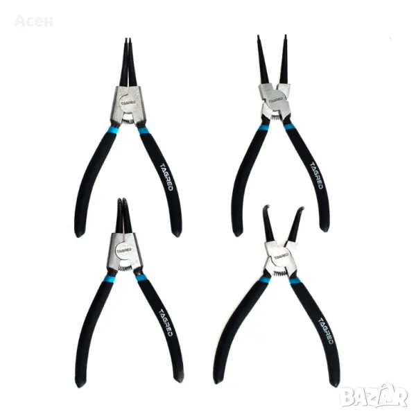 Комплект, пригоден за работа с вътрешни и външни пръстени. Има клещи с извити и прави върхове и 2 вида и: вътрешни (разширяващи се вътре в гилзата) и външни (затягащи, извън вала). Клещите са изработени от здрава и издръжлива хромованадиева стомана с дръжки с гумено покритие. Това са перфектните инструменти за монтиране и премахване на пръстени.