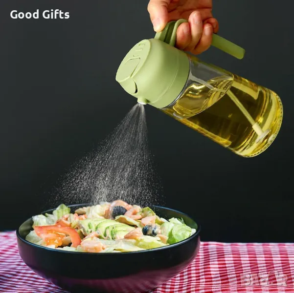 Открийте удобството и функционалността с нашата бутилка със спрей за олио за готвене, която комбинира възможност за пръскане и наливане на олио. Идеална за различни кулинарни приложения – от дресинг за салати до барбекю, печене и пържене, този продукт е незаменим помощник във всяка кухня.