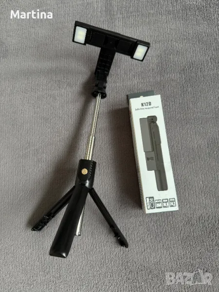 Продавам селфи стик, който може да се използва като стойка, има Led лампи и дистанционно за bluetooth.