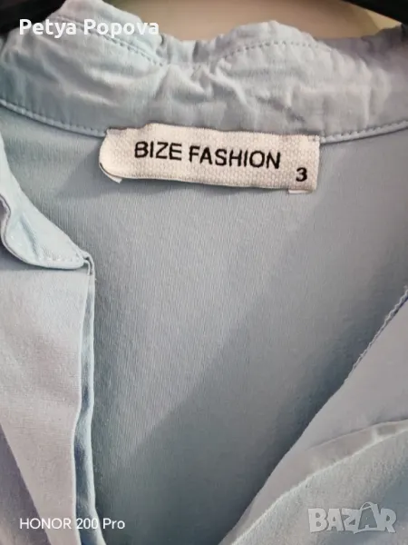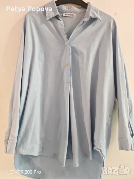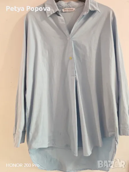 Риза в светло син цвят, 3/4 ръкав, свободен стил. На гърба е с интересна бродерия папагал.