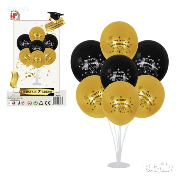 Комплект балони „Честито дипломиране“ – 7 броя с поставка и стойка, готови за празнична декорация
