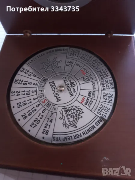 Много запазен вечен календар почти като нов във дървена кутийка със следи от употреба.