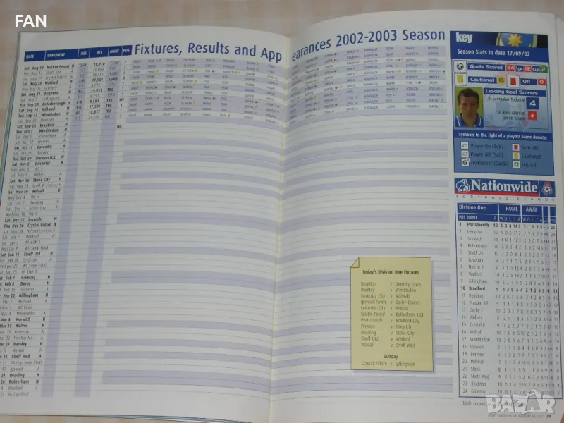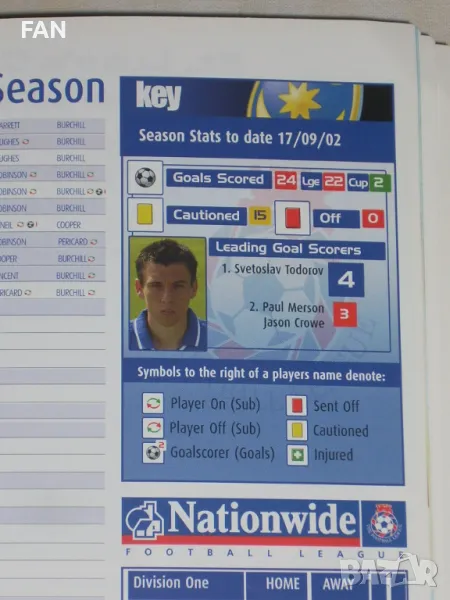 Срещата е от 11-я кръг за първенство на английската 1 Дивизия между отборите на Портсмут и Брадфорд Сити, играна на 28 септември 2002 г. на стадион Фратън Парк, завършила с победа на домакините с 3:0. Светослав Тодоров е в редиците на Портсмут до 85 мин., но не успява да отбележи гол. Въпреки това, той става голмайстор както на тима си, така и на първенството с 26 гола, с което изиграва решаваща роля за класирането на тима си на първо място и завръщането му във Висшата лига под ръководството на мениджъра Хари Реднап. На първата страница на програмата има снимка на Светльо.
