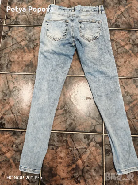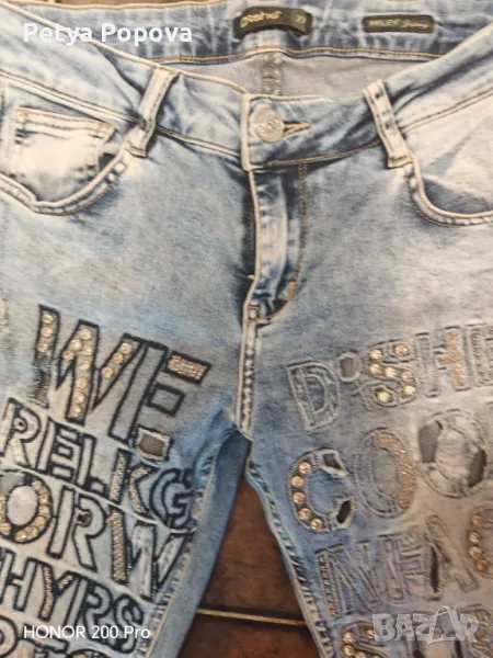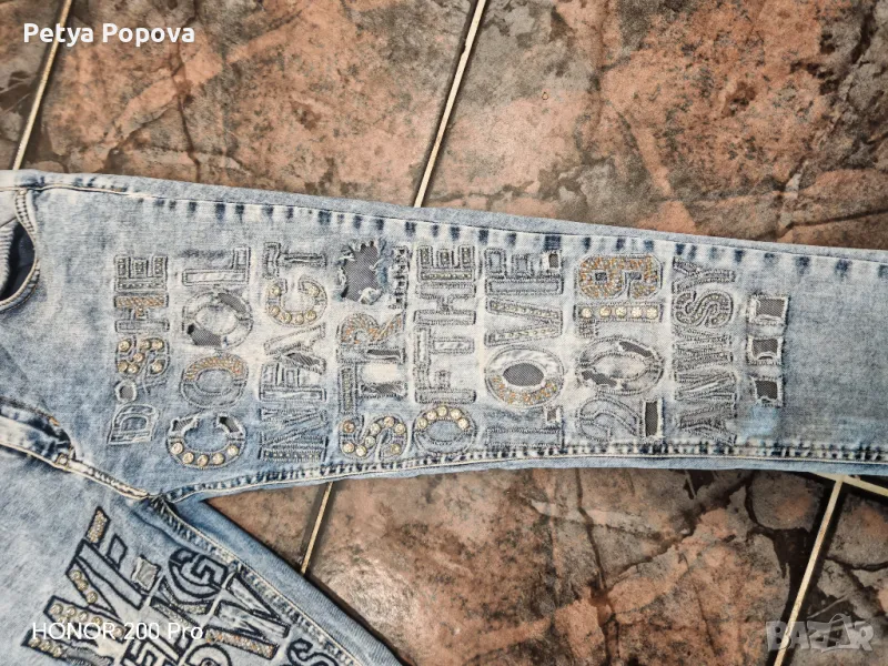 Дънки на марката D She с надписи и камъни, нямат забележки.