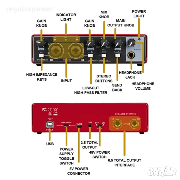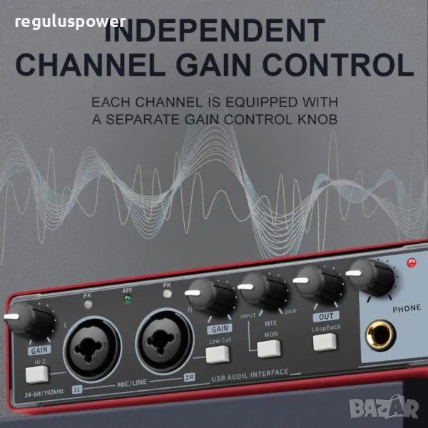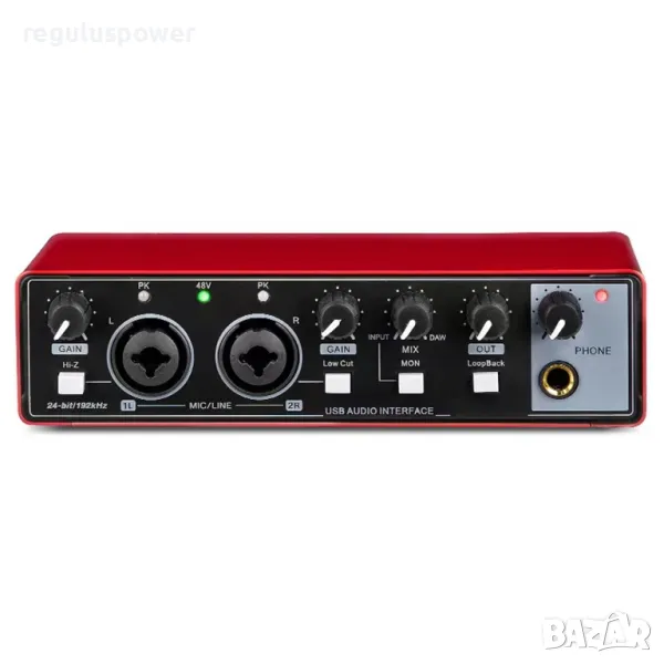 Тази преносима професионална USB звукова карта разполага с вградено 48V фантомно захранване и микрофонен предусилвател. Може да се използва заедно със самостоятелни първокласни предусилватели, предлагайки достатъчен запас от сила на звука, ниско ниво на изкривяване и ултра нисък шум. И двата микрофонни предусилвателя имат независими копчета за контрол на силата на звука, индикатори за сигнала, индикатори за претоварване и бутони за бързо включване/изключване. Използвайки кондензаторни микрофони, можете да внесете изключителна яснота и детайлност в записите си, което ги прави идеални за запис на инструмент или вокал.