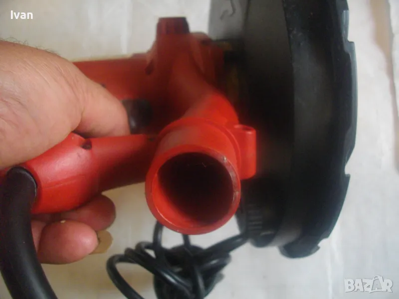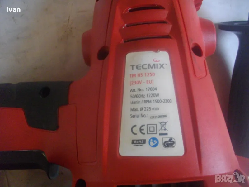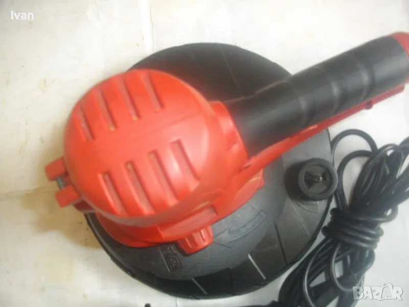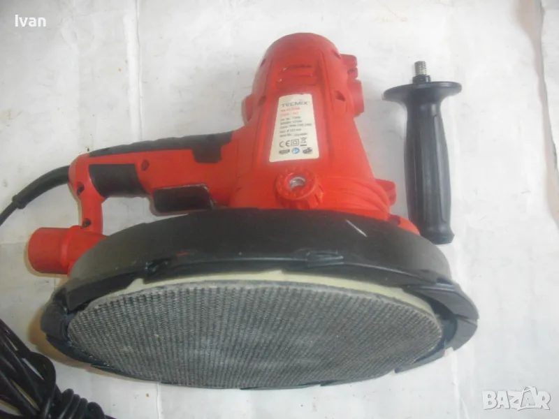 Много голям, масивен виброшлайф за гипсокартон, немски профи модел, с хипер мощност от 1220 вата , и много голям диаметър на работна пита-плоча за шлайфане -размер ф 225мм. Марка и модел на машината - TECMIX TM HS 1250. Немско оригинално производство. Машината е ползвана само веднъж. Като нова е- трудно различима от нова. В отлично техническо състояние. Работи много добре. Мощност на мотора - 1220 вата, обороти - 1500-2300 вм минута, регулируеми с регулатор 6 степени. Работен плот-пита - тип Велкро, със самозалепващи елементи-размер хипер голям ф 225 мм. Отстрани плота е обграден с пластмасов предпазител на пружини, за обиране на вибрациите, и регулация на дълбочината на шлифоването. Четки - външни. Вградени места в корпуса от двете страни за странична дръжка. Оригиналната здрава и корава странична дръжка е налична. Гумирано покритие на задната дръжка - нехлъзгащо се, противоударно. Много дълъг конектор на отпадъчен прах за скачване в торба за прах или прахосмукачка. По европейските сайтове и магазини машината се продава за около 183 евро. Тегло на машината - 2,8 кг. Размери - 325/325/270 мм. Техн.наименование - ,,шлайф за гипсокартон".