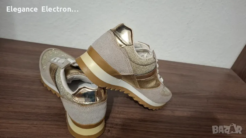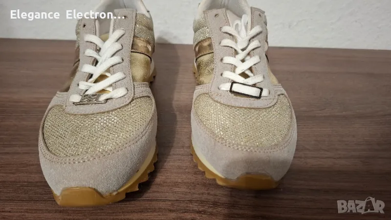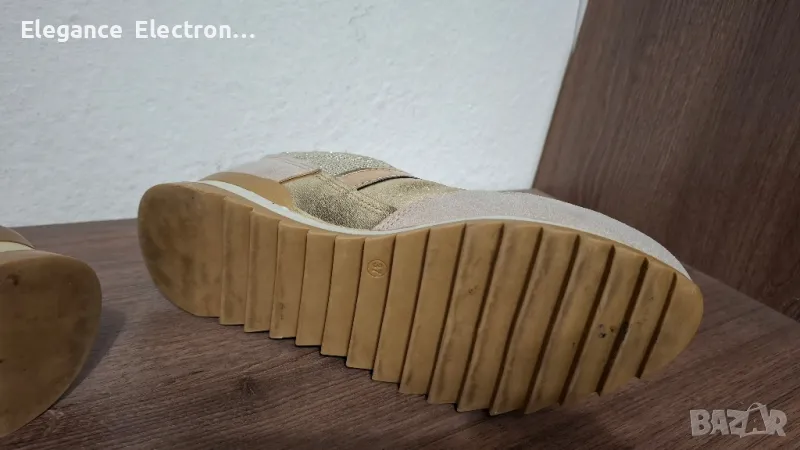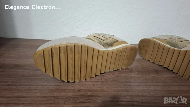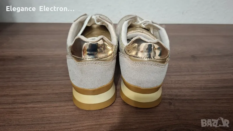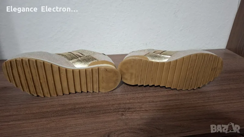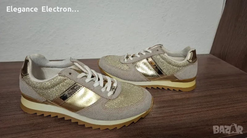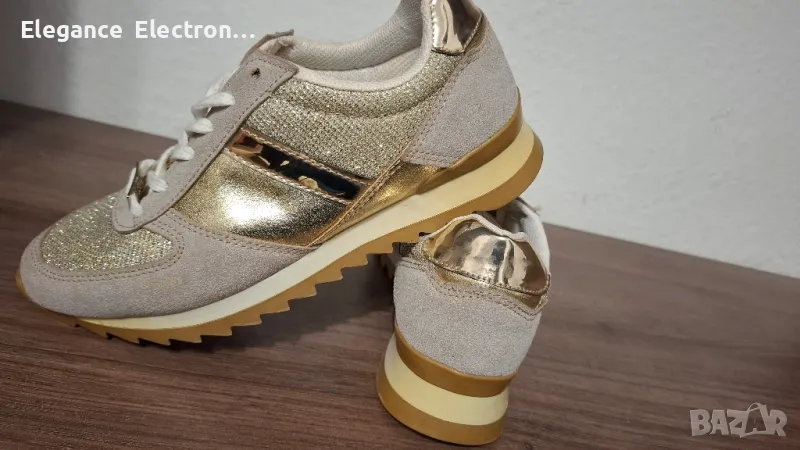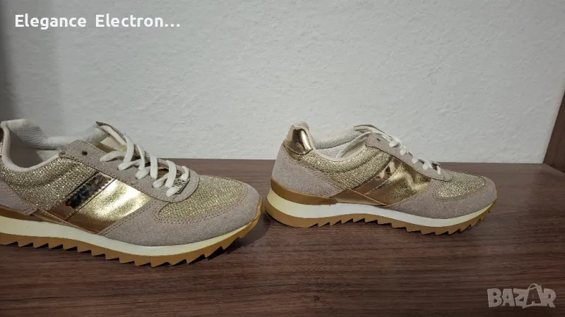 Продавам елегантни дамски маратонки Butigo, номер 37 (UK 4 / US 6.5), с дължина на стелката 23.8 см. Цветът е стилен бежов с блестящи златисти елементи, които придават модерен и изискан вид. Подходящи както за ежедневие, така и за по-елегантна визия.