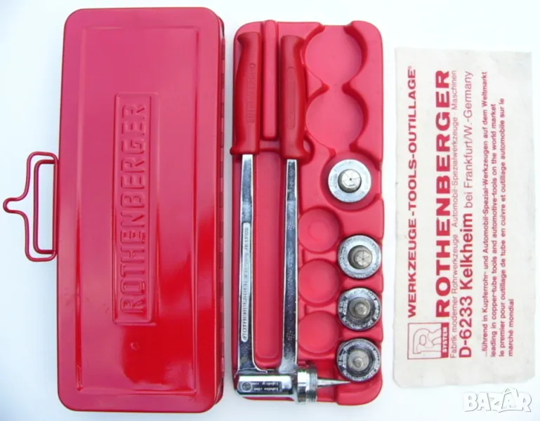 • АРТИКУЛ: Оригинал Класически Професионален Немски Специализиран 5+2 части К-т ТРЪБОРАЗШИРИТЕЛ с Клещи и Калибратори глава тип цанги с 6 сегменти Раздувач Ръчна Преса за муфиране на тънкостенни метални Тръби на Климатик Хладилник Фризер и др.; Марка: ROTHENBERGER ( РОТЕНБЕРГЕР ); Модел: тип 12300;