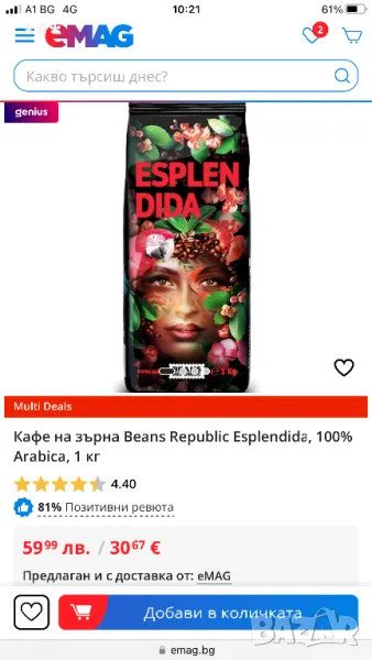 Продавам Кафе на зърна Beans Republic Esplendida, 100% Arabica, 1 кг → Обява 50250180