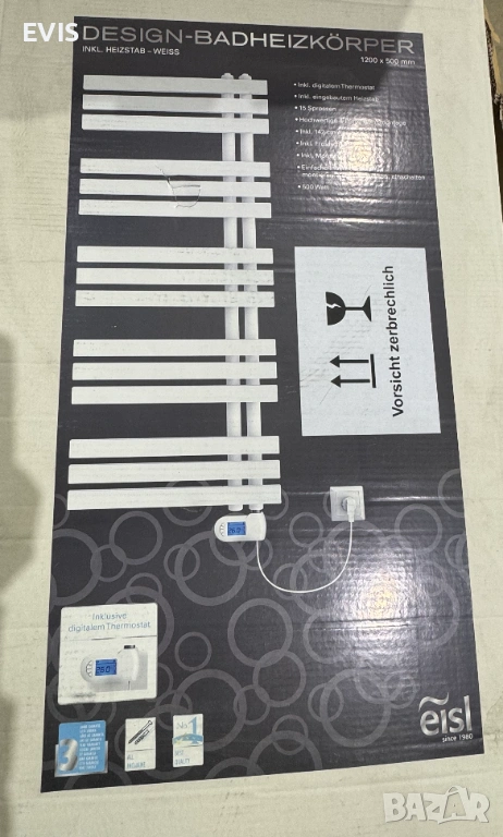 Продавам чисто нова дизайнерска електрическа лира за баня с мощност 500W. Включва вграден нагревателен елемент и дигитален термостат за точно управление на температурата.