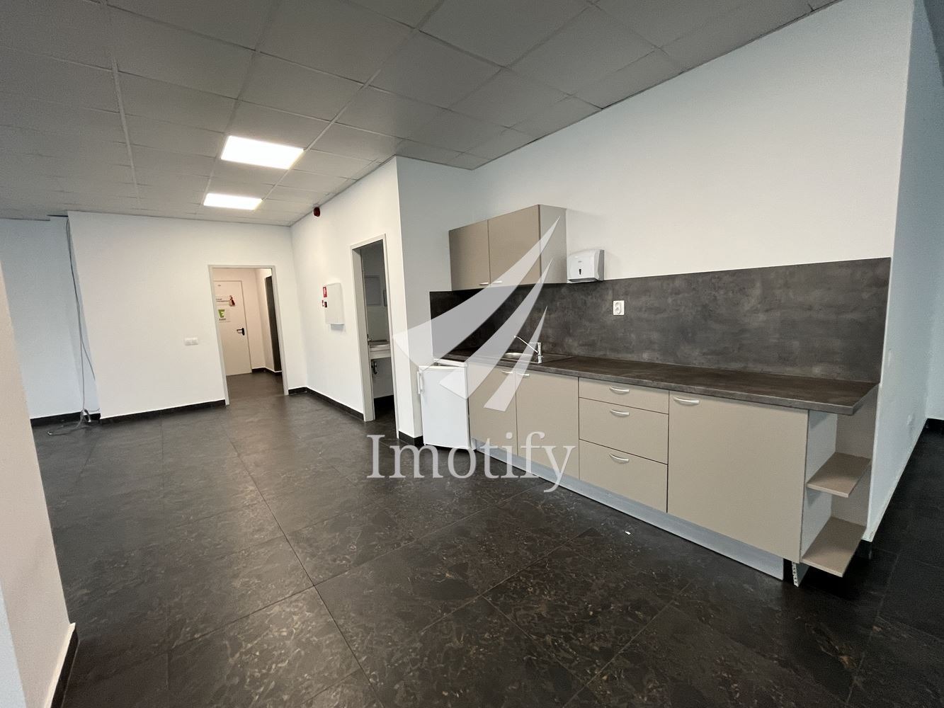 Голямо Open space помещение с 2 санитарни помещения, тераса и кухненски бокс. Офисът може да бъде изцяло с Open space разпределение или допълнително преграден според изискванията на Наемателя.