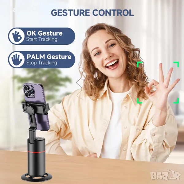 Този държач за телефон с функция за проследяване на лице използва AI изчислителна система, която може автоматично да разпознава и проследява лицето или тялото ви, да се завърта на 360° постоянно с вашето движение. Освободете ръцете си за видео разговори и стрийминг на живо. Когато сте обърнати към камерата, жестът „OK“ означава включване на проследяването, докато жестът „отворена длан“ означава паузиране на проследяването, което е много удобно. Можете също да използвате нашето включено безжично дистанционно, за да се свържете с телефона си, без да е необходимо приложение.