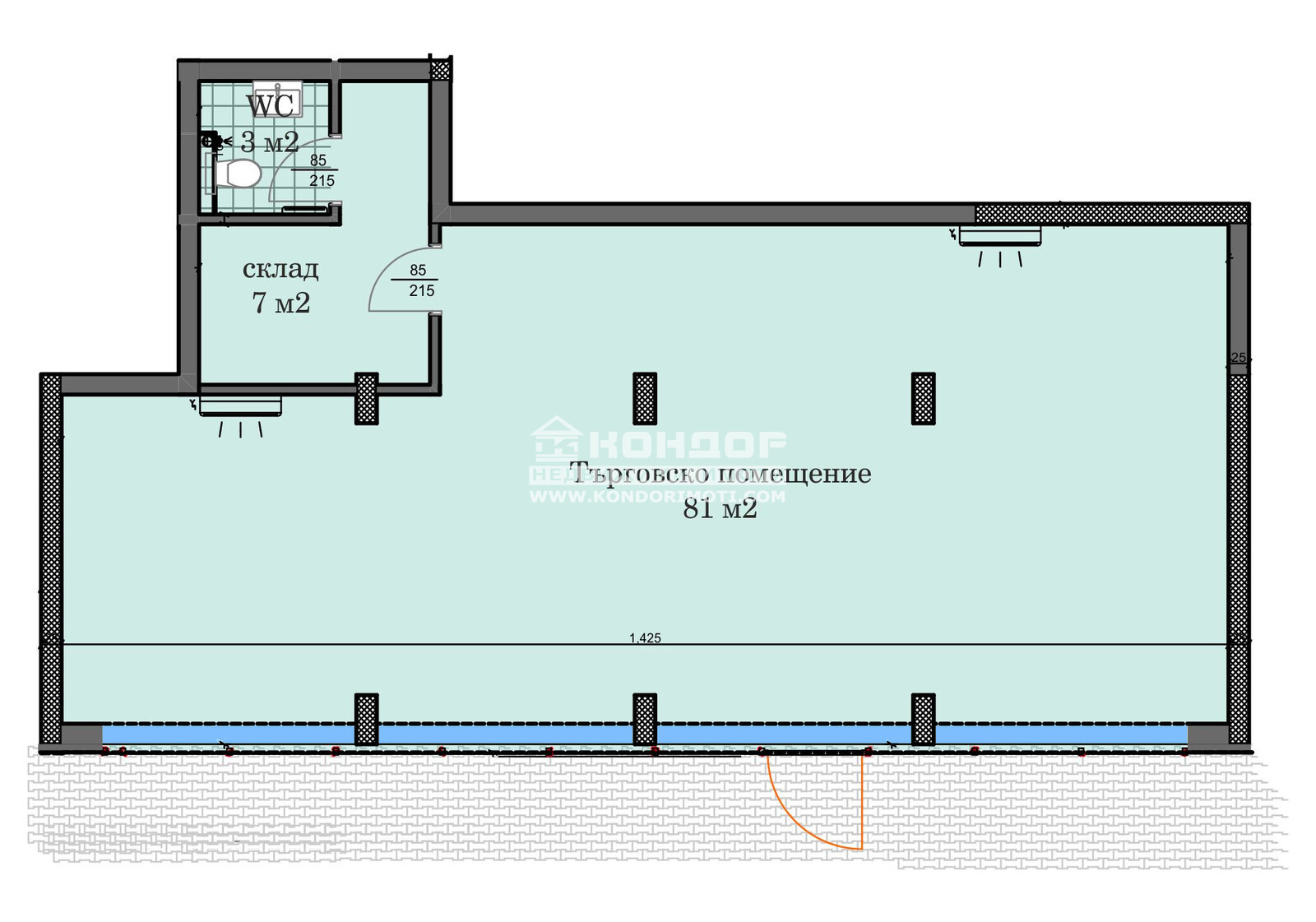 Оферта 64196: Предлагаме Ви възможността да закупите Лицев Магазин с голяма стъклена витрина в новоизграждащ се луксозен жилищен комплекс с модерна визия. Обекта е с лице към главен и оживен булевард с възможност за светеща реклама. Разположен е на едно ниво - партерно и се състои от едно голямо търговско помещение с височина 4.30м. с реална възможност да се отдели на няколко по-малки, склад, санитарен възел с преддверие. Магазинът е подходящ за всякакъв тип търговска дейност- магазин, салон за красота, кабинет, офис представителство и други, като има възможност за преграждане и преустройство спрямо нуждите на клиента. !!! Обекта ще бъде завършен до Ключ с направени подови настилки от високачествен гранитогрес, стети на цветен латекс, окачен таван с поставенти осветителни тела и вградени климатици, напълно оборудван санитарен възел, като сме приложили снимки в галерията на тази оферта от друг готов обект на същия Инвеститор, за да придобиете представа за нивото на завършването и начина на издаване. Едно от основните му предимства е страхотната локация, отлична комуникативност и динамична пътна инфраструктура, която осигурява бърз и лесен достъп до комплекса, от всяка точка на града. Изключителна съвременна архитектура и модерна технология на строителство. Има възможност за закупуване на паркомясто пред помещението!!! Гъвкави схеми на разсрочено плащане спрямо възможностите на клиента в рамките на строителството или закупуване чрез Банков Кредит, на изключително изгодни условия за клиенти на агенцията !!!ВИЖТЕ ОЩЕ ИЗГОДНИ ОФЕРТИ НА https://www.kondorimoti.com/ С ЕЖЕДНЕВНА АКТУАЛИЗАЦИЯ!