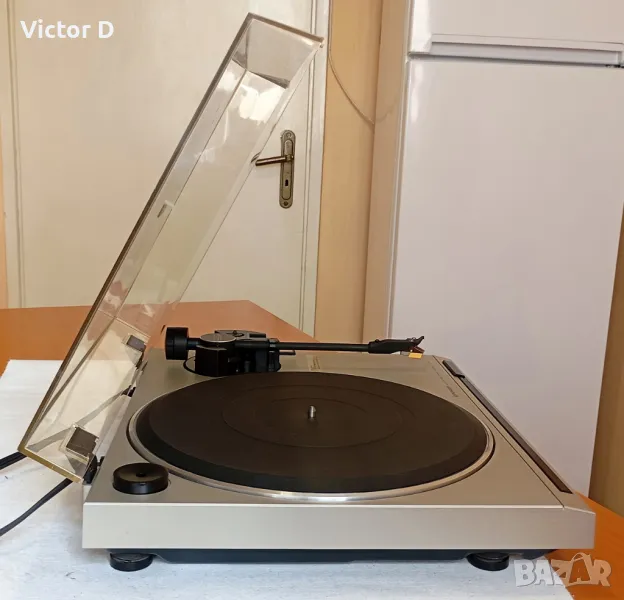 Профилактиран и перфектен технически.Здрава оригинална елиптична игла.Много запазен визуално с изключение на капака,който има няколко петна,поради което съм залепил подходящо фолио.Ремъчно задвижване.Автоматично изключване след просвирване.Ръчни настройки противотежест и антискейтинг.Произведен в Япония.Продавам профилактирани и грамотно проверени грамофони.Вижте обявите ми!