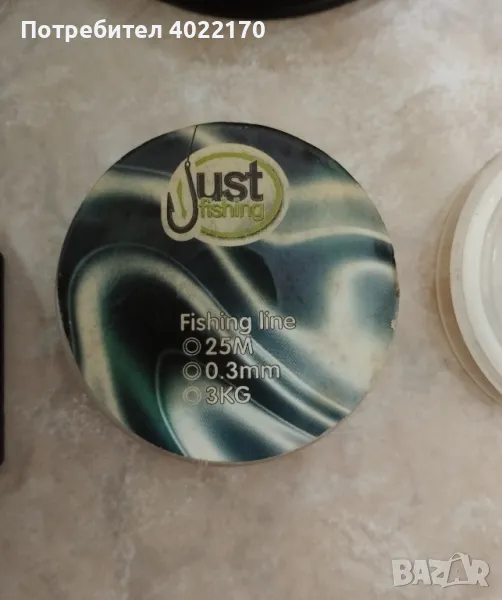 Трети ред ред - Carp Kinetics Silt Green 0.25/3.6 кг/100 м (може да е ползвано от него), цената му в Англия е 5 паунда ролката, до него е Wolfgang 0.30/9 кг/100 м, от зад на пластмасата пише D.A.M Octa (ново), другите 2 малки са Just Fishing 0.30/3 кг/25 м (едното е ново, другото може да ползвано от него.
