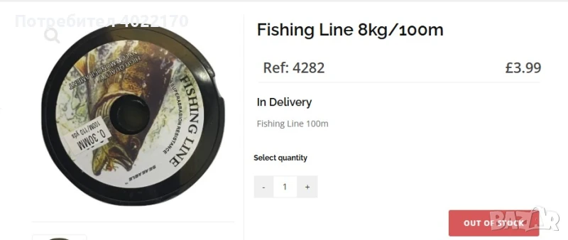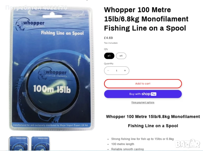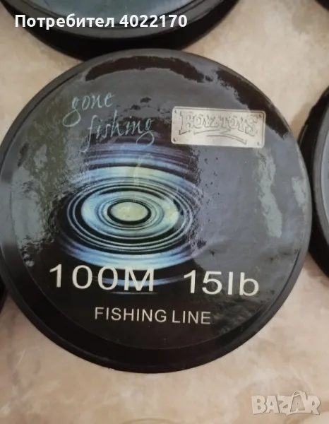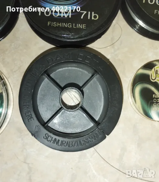 Първи ред от горе - SEA EAGLE (не е тази марка, която е в БГ), 0.30/4 кг/100 м (ново), цена в Англия 4 паунда ролката, следващите 3 броя са Whopper, 15 либри/6.8 кг/100 м (нови), цената им в Англия е 4.70 паунда за ролка.