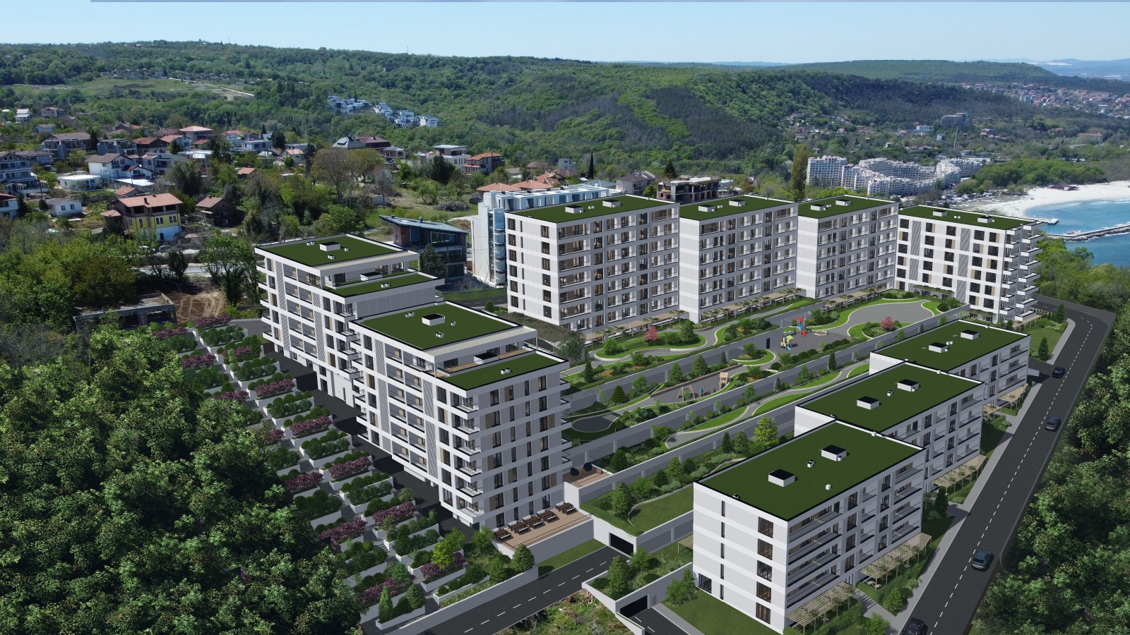 Етап 1 - Ще се състои от 9 сгради, с различна етажност и разположение. Във всяка сграда ще има функционални разпределения на 1-стайни, 2-стайни, 3-стайни и 4-стайни жилища, като всички ще имат уникална глекда още от приземен етаж.
