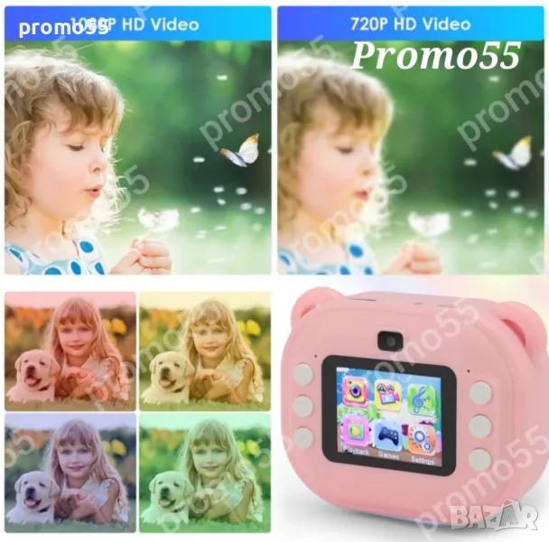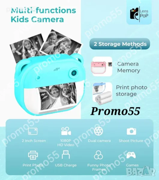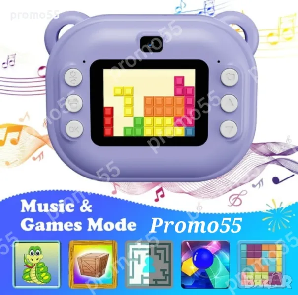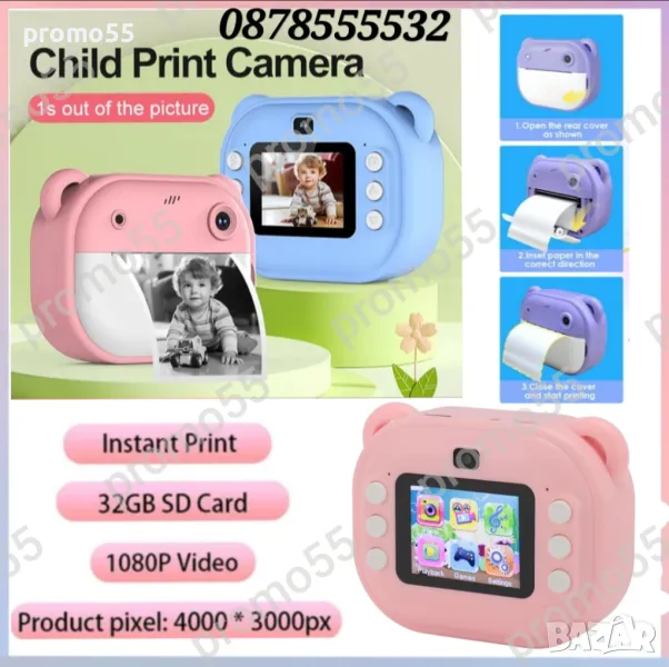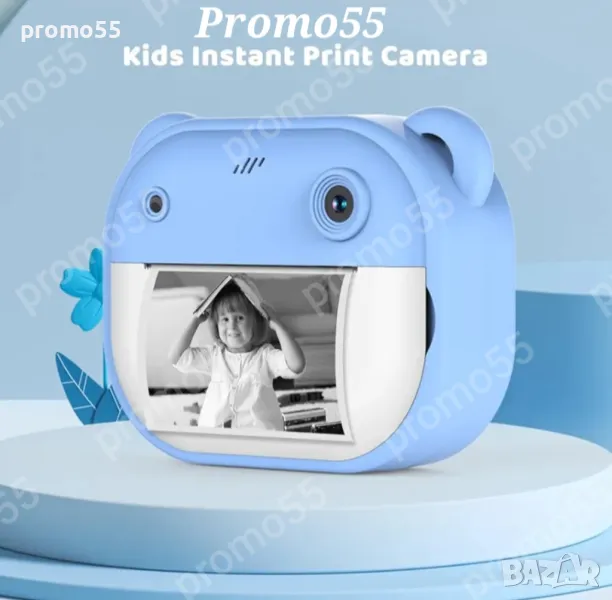 Детски фотоапарат-камера с 2 инчов цветен екран, незабавен печат, принтер за моментални снимки и функции „Направи си сам“, включени забавни игри, поддържа филтри и рамки, МР3 плеър, селфи функция, позволявайки на децата да персонализират своите снимки. Разполага с функции като таймерно снимане, непрекъснат режим на снимане и циклично записване.