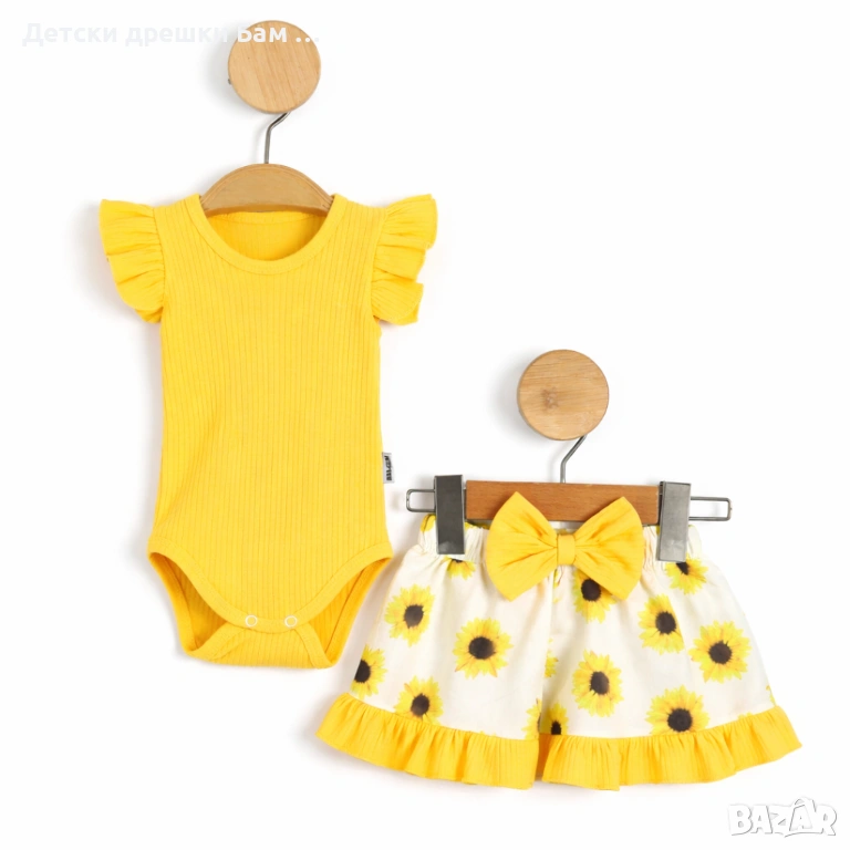 🎀Това комплектче е като слънце в гардероба – жълто рипсено боди с къдрички на ръкавите, съчетано с удобна пола-панталон със сладък принт на слънчогледи и голяма панделка отпред.🎀