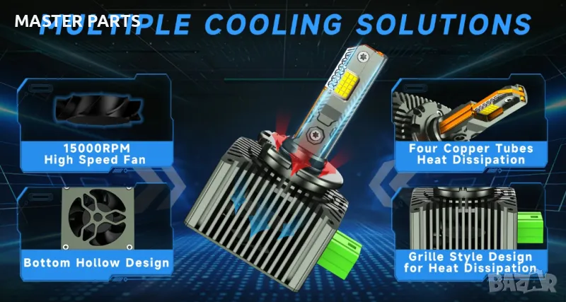 - С най-доброто охлаждане: 4 медни тръби и умен смарт вентилатор, контролиран от сензор за температура, гарантират постоянна студена работа на LED чипа и максимален живот.