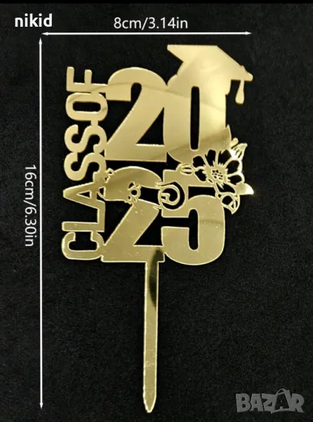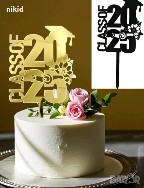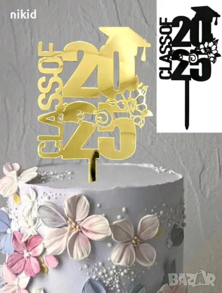Class of 2025 тога с цвете черен златист пластмасов топер завършване бал Абитуриент абсолвент декор → Обява 50261530
