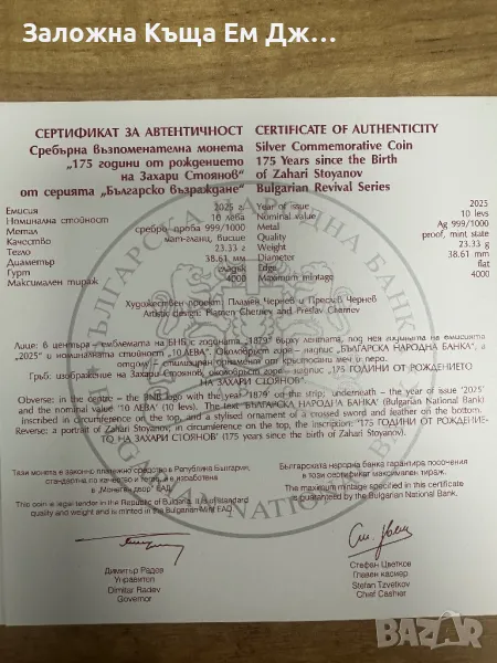 Сребърна възпоменателна монета 175г. От рождението на Захари Стоянов → Обява 50264132