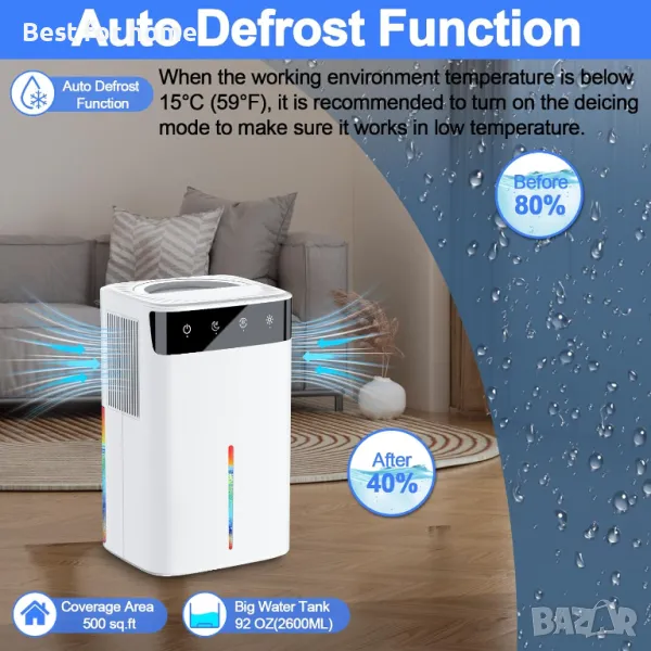 Функция за автоматично размразяване: Когато работната температура на мини влагоабсорбатора е под 15°C (59°F), се препоръчва да включите режима за размразяване, за да сте сигурни, че ще работи при ниски температури. Когато режимът за размразяване е активиран (чрез натискане на бутона за размразяване), влагоабсорбаторът ще загрява кондензатора за 3 минути на всеки 30 минути, за да предотврати замръзване в работни среди с ниски температури.