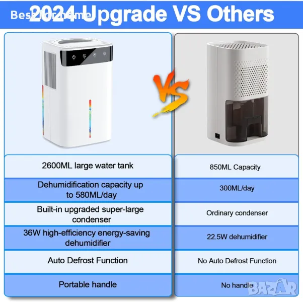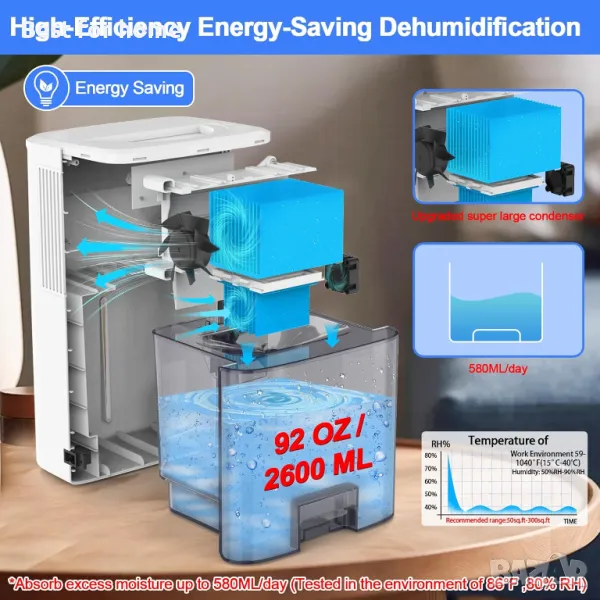 обезвлажнител може да отстранява до 580 мл вода дневно при 86℉ и 80% относителна влажност. В допълнение, номиналната мощност от 36 W, високата ефективност и енергоспестяващото обезвлажняване ефективно намаляват влажността в помещенията до под 40%, създавайки суха и комфортна среда.