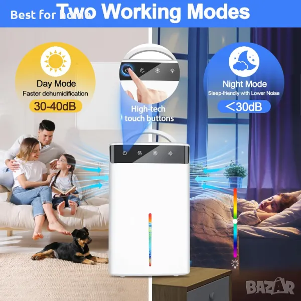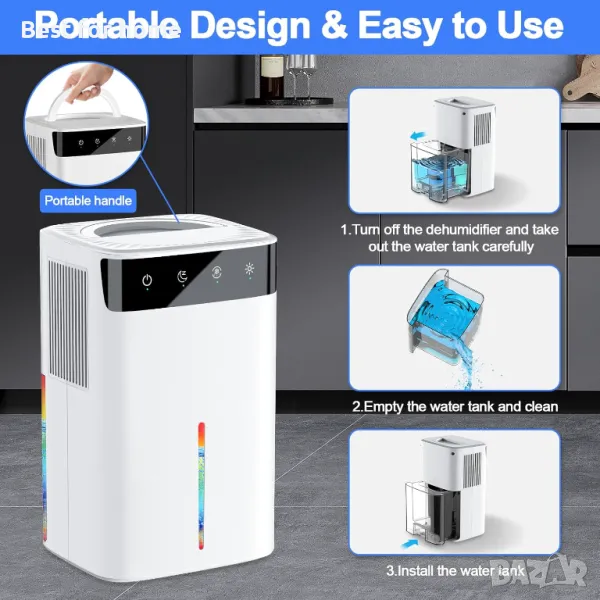 【Сензорен екран и широко приложение】Нашият преносим влагоабсорбатор ви помага да премахнете излишната влага от въздуха в спални, дневни, гардероби, кухни, кемпери, гаражи, офиси. Увеличете комфорта си и подобрете потребителското си изживяване с нашето интуитивно сензорно управление. Влагоабсорбаторът може ефективно да намали влагата във въздуха, да помогне за пречистването му, да защити дихателните пътища и да е от полза за вашето здраве. Моля, поддържайте входа за въздух в горната част на влагоабсорбатора и изхода за въздух отзад свободни.