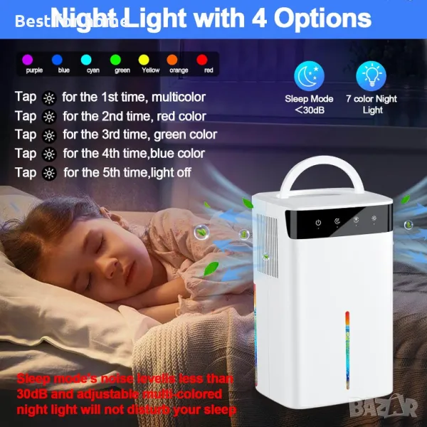 <30dB нисък шум и цветна светлина: Влагоабсорбаторите за спалня работят тихо. Режим на сън е по-малък от 30 dB, така че няма да се чувствате обезпокоени, докато спите. Влагоабсорбаторът, оборудван с цветни светлини, осигурява светлината, от която се нуждаете, когато ставате през нощта. (Забележка: Цветовете могат да бъдат постоянно включени и изключени)