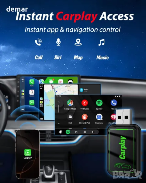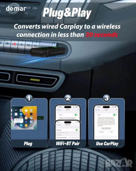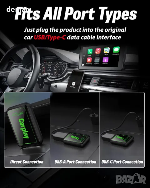 Този безжичен CarPlay адаптер преобразува кабелния CarPlay в безжична система само за 30 секунди и се свързва автоматично в рамките на 4–8 секунди всеки път, когато стартирате колата. Той поддържа както USB-A, така и USB-C портове, работи с 99% от автомобилите, произведени след 2016 г., които имат кабелен CarPlay, и запазва всички оригинални функции на CarPlay. С подобрен Bluetooth 5.0 и 5.8GHz WiFi за подобрена стабилност и скорост, той осигурява по-плавна, по-бърза и по-издръжлива връзка с подобрена производителност благодарение на 37 персонализирани оптимизации.