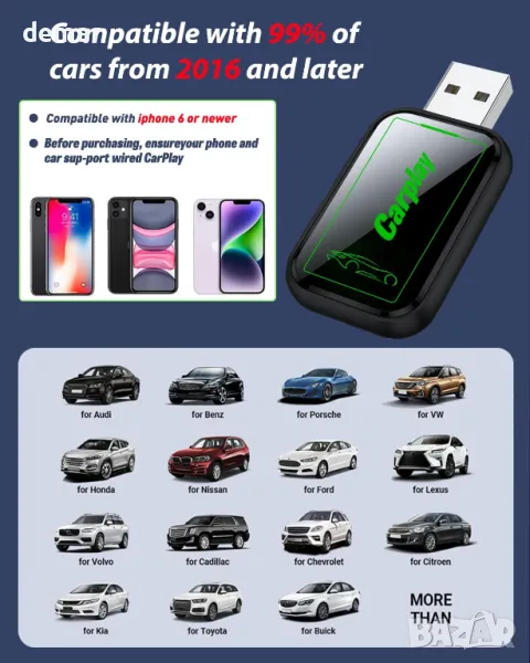 Безжичен Carplay адаптер, Съвместим с 99% от автомобили от 2016 г. и по-нови