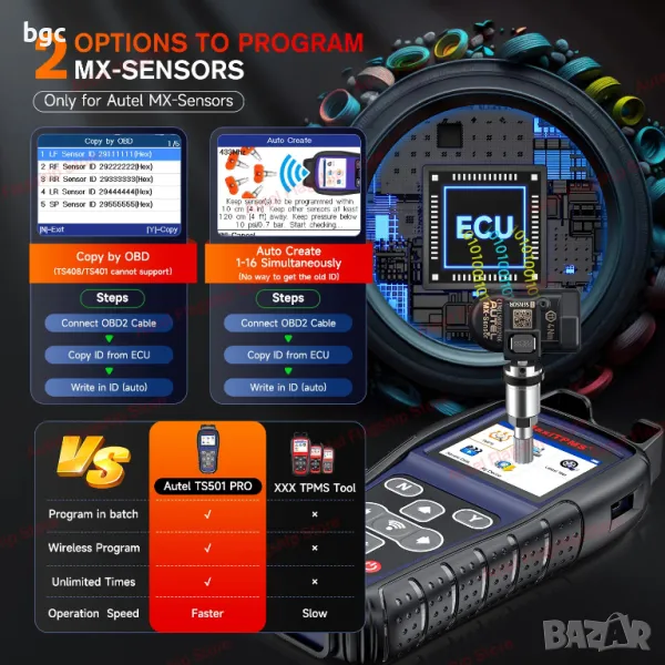 TS501 Pro позволява на всички автомобилни ентусиасти лесно да програмират данни от сензори към Autel MX-сензори, спестявайки ви пари и пътуване до дилърство. С TS501 можете да програмирате AUTEL MX-сензор (315/433MHz) с професионални опции за програмиране: Копиране чрез OBD (не е налично с TS408) и Автоматично създаване на 1-16 сензора, за да замените дефектен сензор с нисък живот на батерията или такъв, който не функционира добре. Забележка: TS501 Pro може да програмира САМО Autel MX-сензори. НЕ може да програмира сензори от други марки.