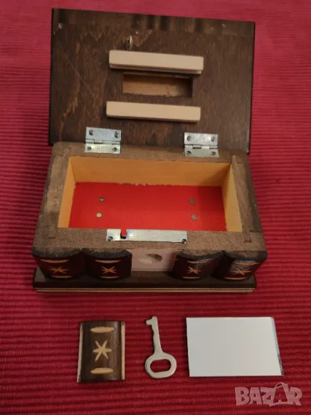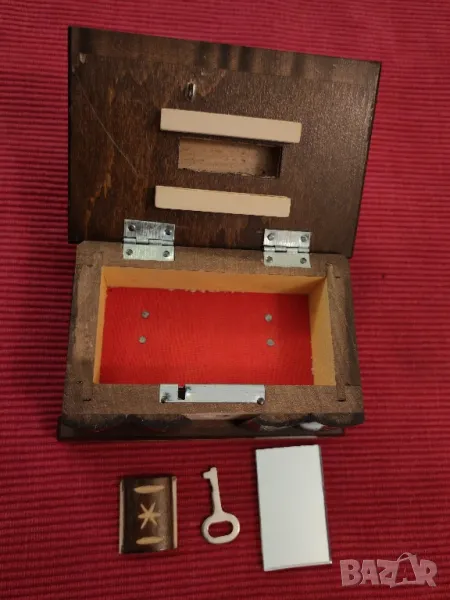 Стара сувенирна кутия за бижута Будапеща. Кутията е от дърво с медно изображение на Будапеща. Ръчно изработена, ръчно резбована с скрито отделение в капака зад огледалцето, кух капак. С ключалка и ключе и елемент за скриване на ключалката. Отлично състояние, няма забележки. Еконт, Спиди, лично предаване,