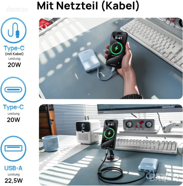 Тази компактна външна батерия с капацитет 10000 mAh осигурява бързо зареждане от 22,5 W и разполага с вграден USB-C кабел за допълнително удобство. Тънкият ѝ дизайн я прави лесна за носене, а множеството портове ви позволяват да зареждате няколко устройства едновременно, включително телефони, таблети и аксесоари – идеална за ежедневна употреба или пътуване.