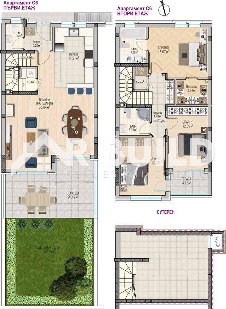 Първо ниво просторна дневна зона, трапезария и кухня с директен излаз към веранда и самостоятелен двор.