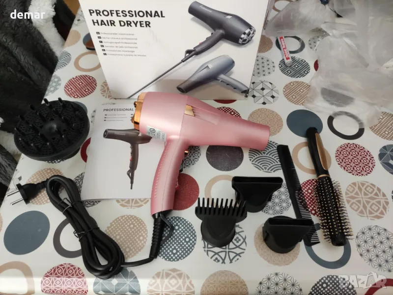Професионален сешоар с йонна струя, дифузер и концентратор, 2 скорости и 3 степени, розов