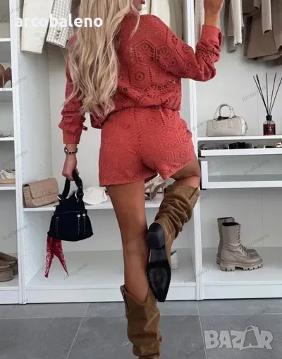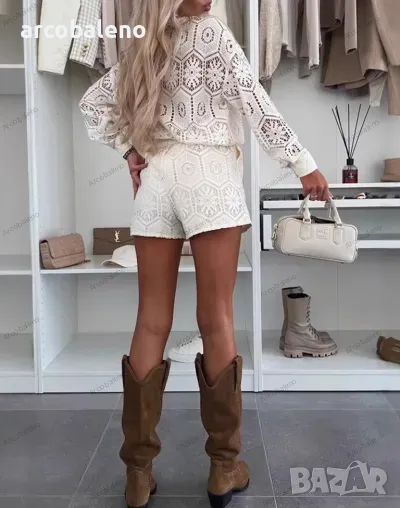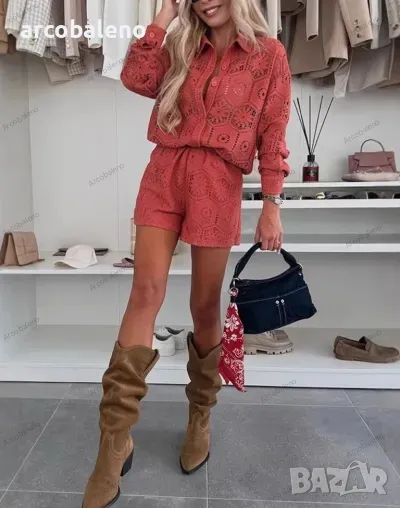 Дамски комплект от две части, дантелени шорти и риза с едноредно закопчаване и яка в ежедневен стил