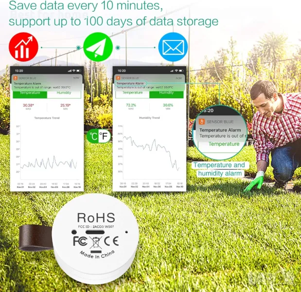 【Безжично управление чрез приложение и интелигентно предупреждение】За някои модели, които имат звуков сигнал на устройството, ако температурата или влажността са извън обхвата, то ще има предупреждение на устройството. Ако е необходимо да проверите графиката или историята, запишете директно стойността на температурата или влажността. Тогава ще ги видите. По-малък размер: (1,3 x 1,3 x 0,47) инча. Отвор за окачване е проектиран за различно разположение, както желаете. Животът на батерията е около 100 дни.