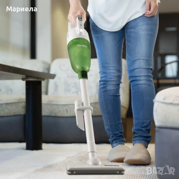 акумулаторна прахосмукачка, снабдена с контейнер за прах с циклонен механизъм, който е разположен отпред за защита от случайни удари. Всмукателният дебит е 1.4 м3/мин.