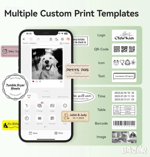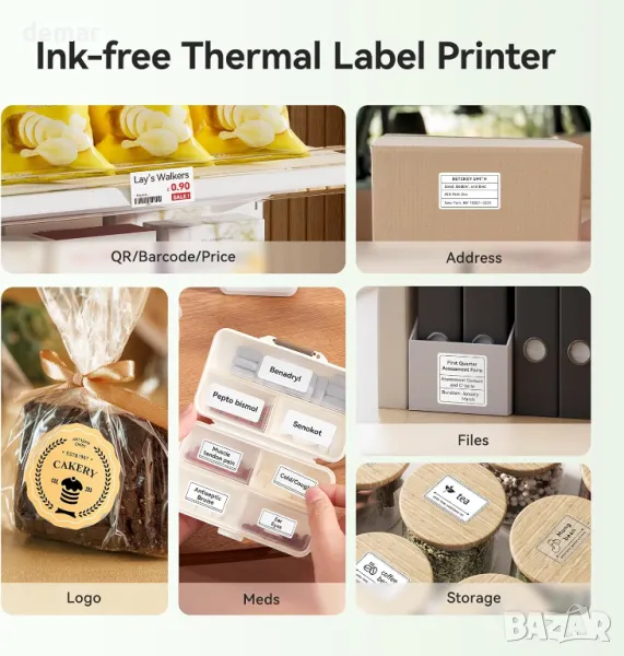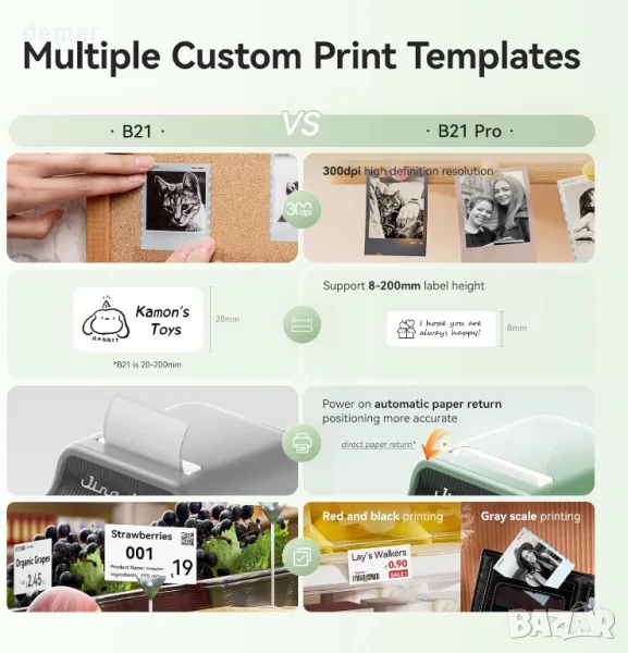 NIIMBOT B21 Pro е безжичен Bluetooth принтер за етикети без мастило, който работи с iOS, Android и PC (чрез драйвер). Той автоматично разпознава етикетната хартия и предлага бърз печат от 60 мм/сек, използвайки издръжливи, водоустойчиви, самозалепващи се етикети. Безплатното приложение поддържа сканиране, разпознаване на изображения, пакетен печат, серийни номера и ви позволява да персонализирате с над 20 шрифта, над 1000 икони и над 100 рамки. Печата етикети с ширина 20–50 мм за различни приложения, като цени, съставки и баркодове. Включва ролка с 230 етикета и поддържа множество видове етикети, включително цветни и прозрачни. Не е съвместим с таблети или етикети за доставка.