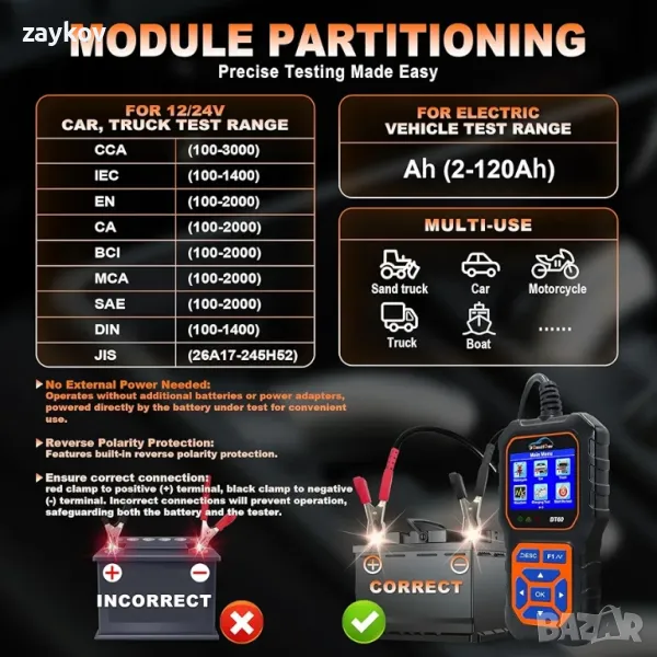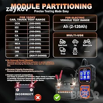Професионален анализ на две батерии】 Прецизно тестван по 9 световни стандарта (JIS/EN/DIN/SAE/IEC), нашият тестер обработва 5-36V литиево-киселинни батерии с точност 99,8% и ±1,5% точност. Характеристики: Проследяване на нивото на заряд (SOC) на литиеви батерии (0-100% с интервал от 0,1%) Откриване на CCA/SOH/пулсации на оловно-киселинни батерии (диапазон 100-3000CCA) 16-точков импедансен анализ за откриване на дисбаланс на клетките Скоби IP67, издържащи на сила от 1000N