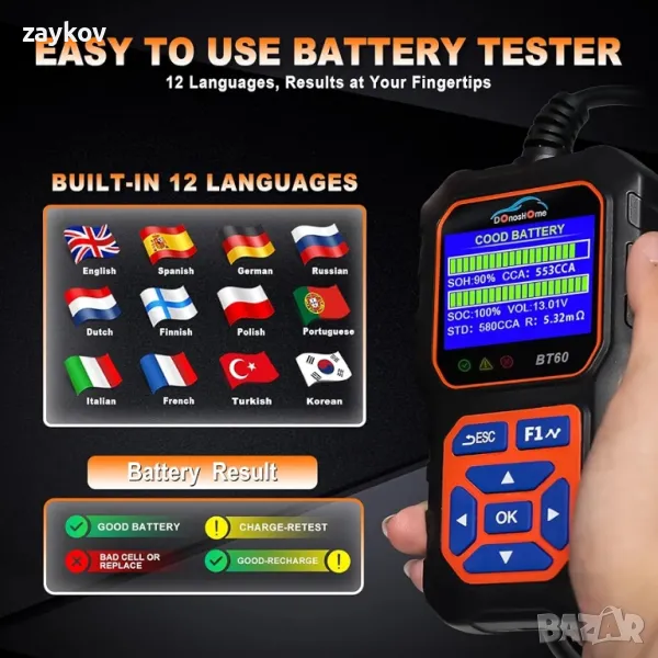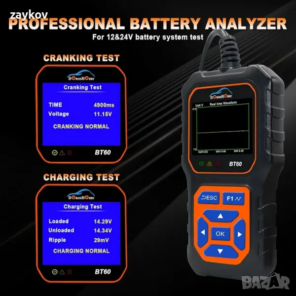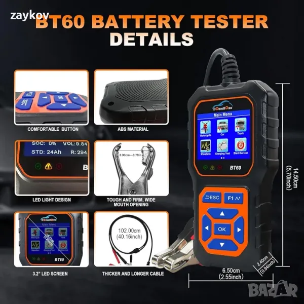 BT60 Pro тестер за батерии 5-36V 100-3000CCA, AGM анализатор на литиево-гелни