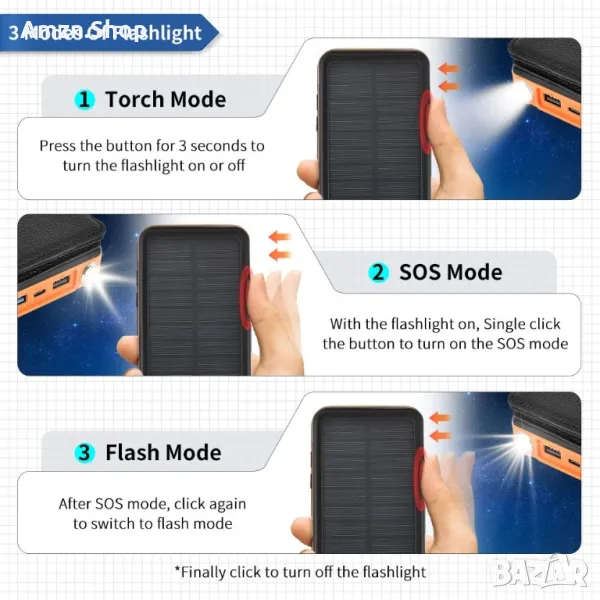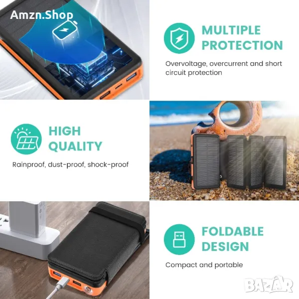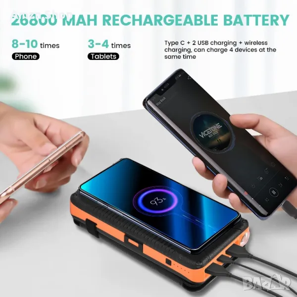 Голям капацитет от 26800 mAh: слънчевата клетка на power bank може да зареди телефона 6-7 пъти, преносимият слънчев панел е съвместим с универсално зареждане, той е практичен и незаменим инструмент за спортисти на открито, може да се използва при тайфуни, урагани и други извънредни ситуации, като например внезапно изключване.