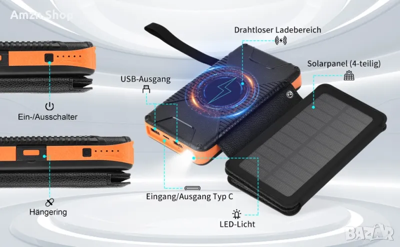 [PD18W+QI10W]: Соларното зарядно устройство за телефон може да зарежда 4 устройства едновременно (2 универсални USB изхода + 1 Type-C изход + WiFi зареждане). То ви позволява да зареждате телефона си с мощност PD18W и да съкратите времето за зареждане; безжичната
