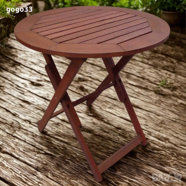 Размери: Ø70xH74 см;Материал: Дърво Meranti/Shorea с висока издръжливост и стабилност;Обработка: Естествено тиково масло;Цвят на дървото: От средно червено до наситено червено-кафяво;Функция за сгъване: За спестяване на място при съхранение.
