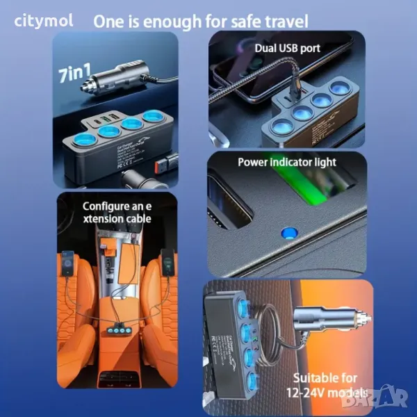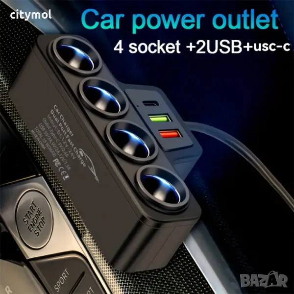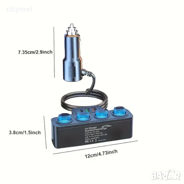 Четворен разклонител на запалката + 3 USB изхода за зареждане на Таблети, Навигации, Телефони, Игри и др. Все по-необходим, удобен и търсен продукт с елегантен дизайн и индикатор за захранване.