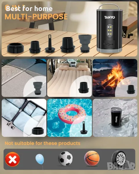 3 пъти по-голям капацитет на батерията: електрическата въздушна помпа с 3600 mAh има време на работа до 30 минути с едно пълно зареждане и може да надуе 108 възглавници, 50 плувни пояса, 42 къмпинг постелки за спане или да изпразни до 45 вакуумни торбички с едно пълно зареждане - числата могат да варират в зависимост от размера на продукта. На открито, акумулаторната надуваема помпа може бързо да се зарежда чрез мобилно захранване, лаптоп или USB порт в колата.