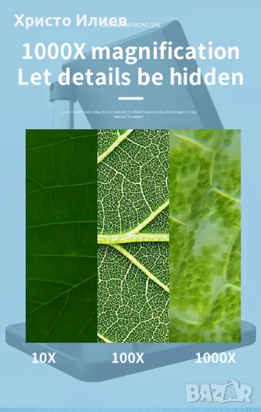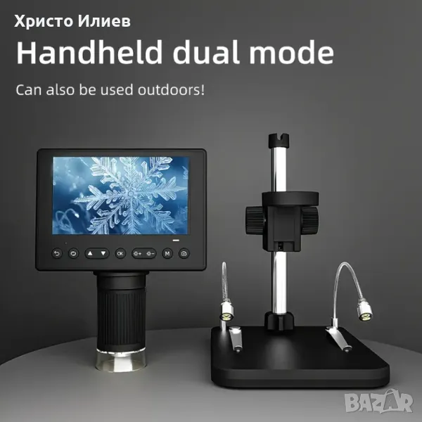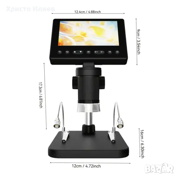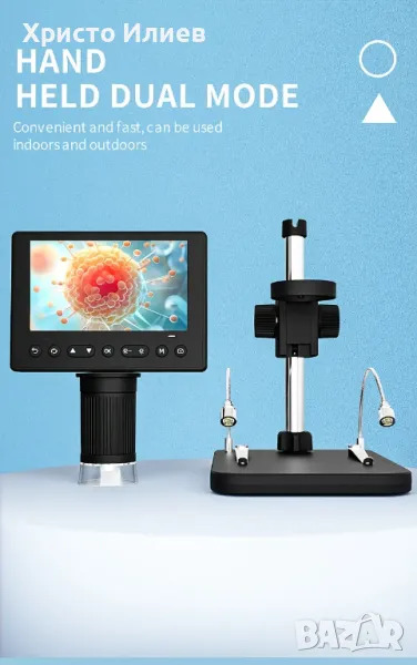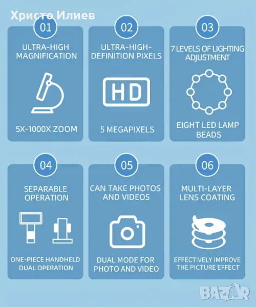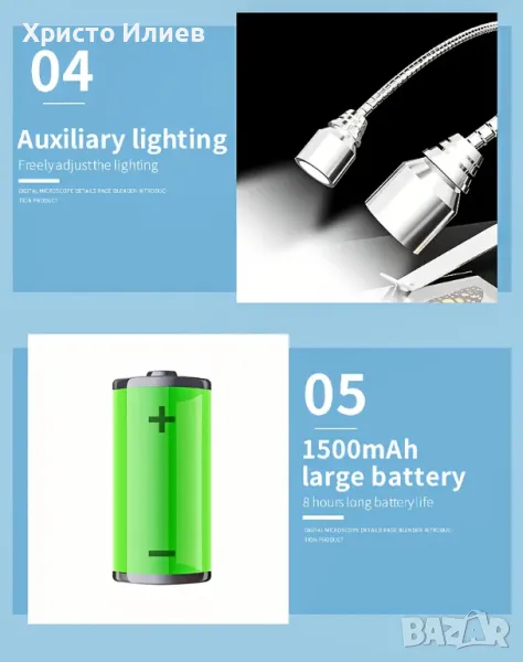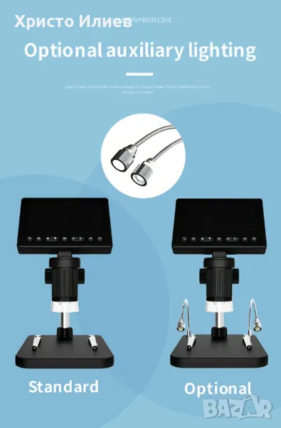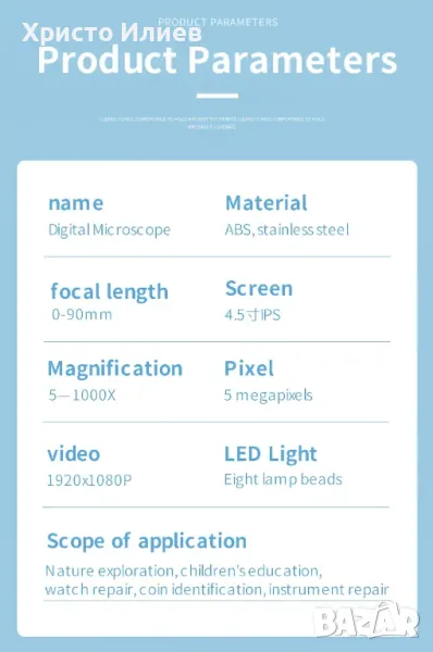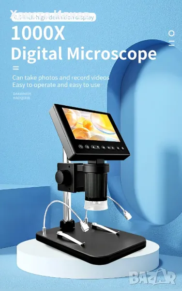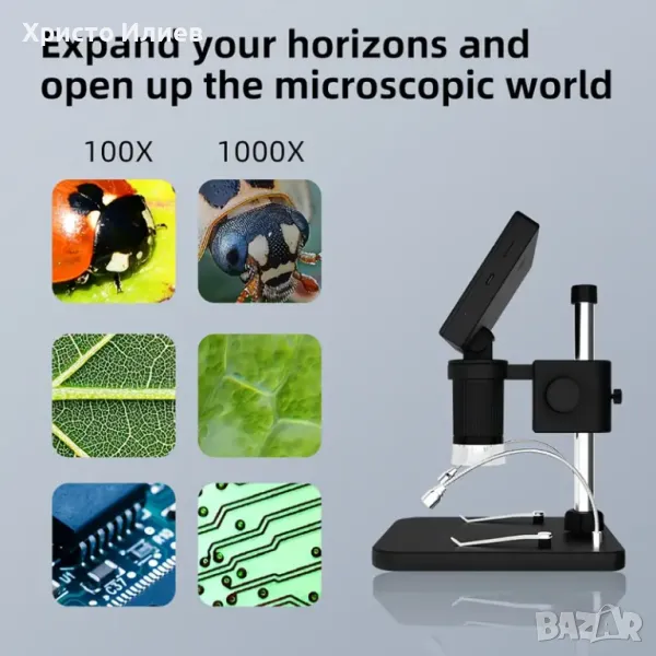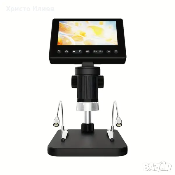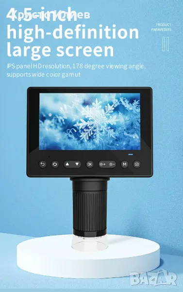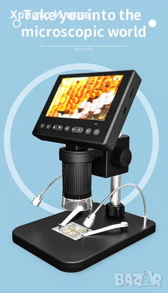Запис и възпроизвеждане на снимки и видеоклипове - видеомикроскопът е не само микроскоп, но и камера, която позволява да правите снимки и видеоклипове. Снимките и видеоклиповете ще бъдат запазени в micro SD картата и ще могат да се гледат на екрана на микроскопа или компютъра. (Максимална поддръжка на 128GB micro SD карта. SD картата не е включена.)